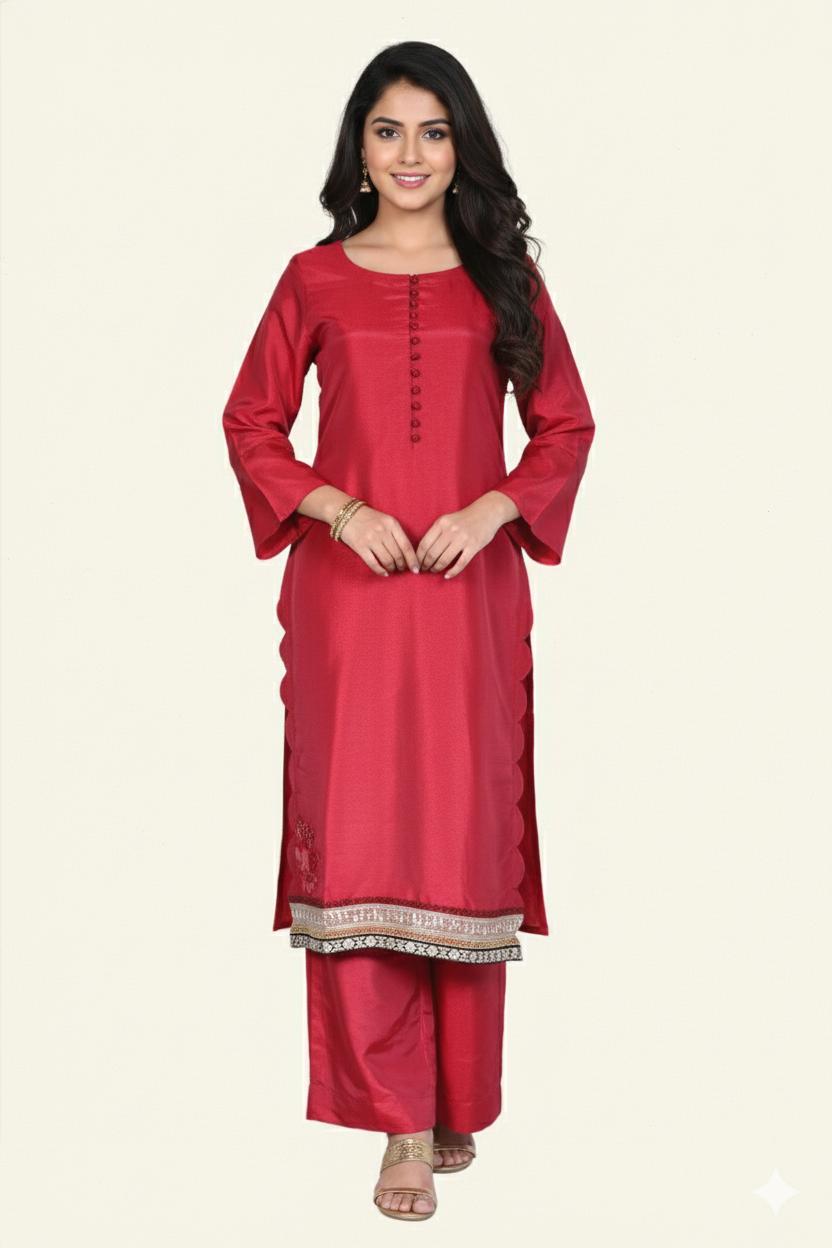 - Description: A 2-piece outfit featuring a sleeveless, printed kurta with a keyhole design, paired with matching pants featuring a straight silhouette.